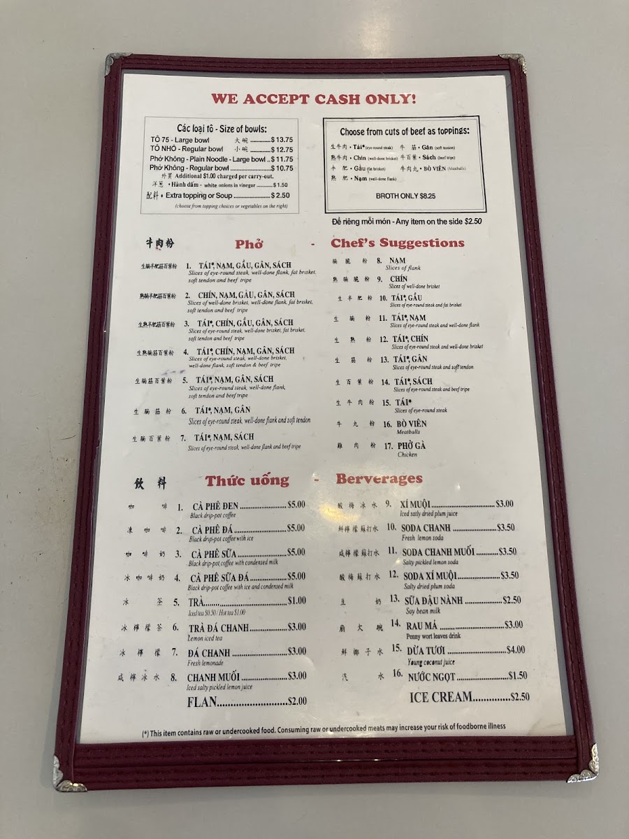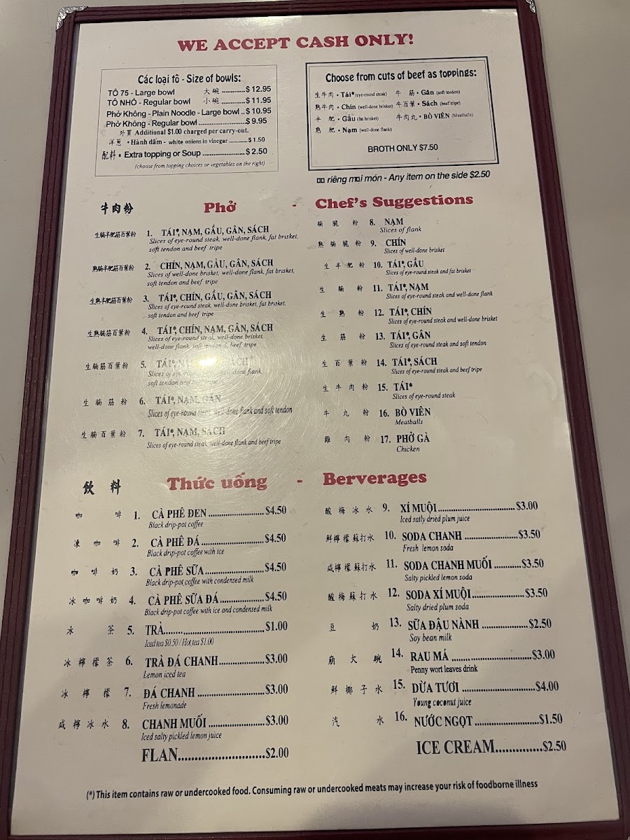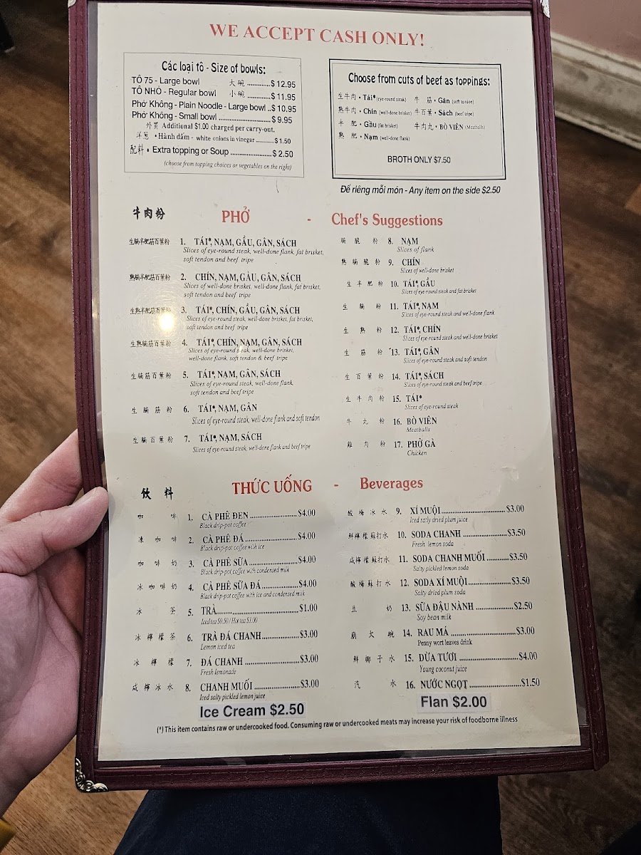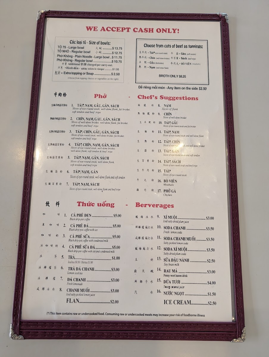 Welcome to Phở 75, where dedication to the art of pho shines. Located at 1122 Washington Ave F in Philadelphia, this restaurant is a haven for pho lovers. Known for their superb broth, the menu features a range of soups, with a Regular Bowl at just $5.75 and a Large Bowl for $6.45. Chef's suggestions highlight premium cuts like eye round steak, brisket, and tendon, providing a rich and satisfying experience. Desserts like dried logans and jello are simple yet delightful, each priced at $2.00. Diners rave about the freshness of ingredients and the friendly, attentive service. While some find the flavor a touch bland, many, like long-time customer Emil Yao, declare Phở 75 the best pho on the East Coast. With a commitment to exceptional pho, this restaurant truly caters to those seeking comfort in every bowl. Get ready for a delicious, aromatic adventure!