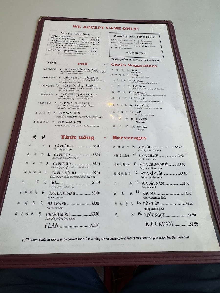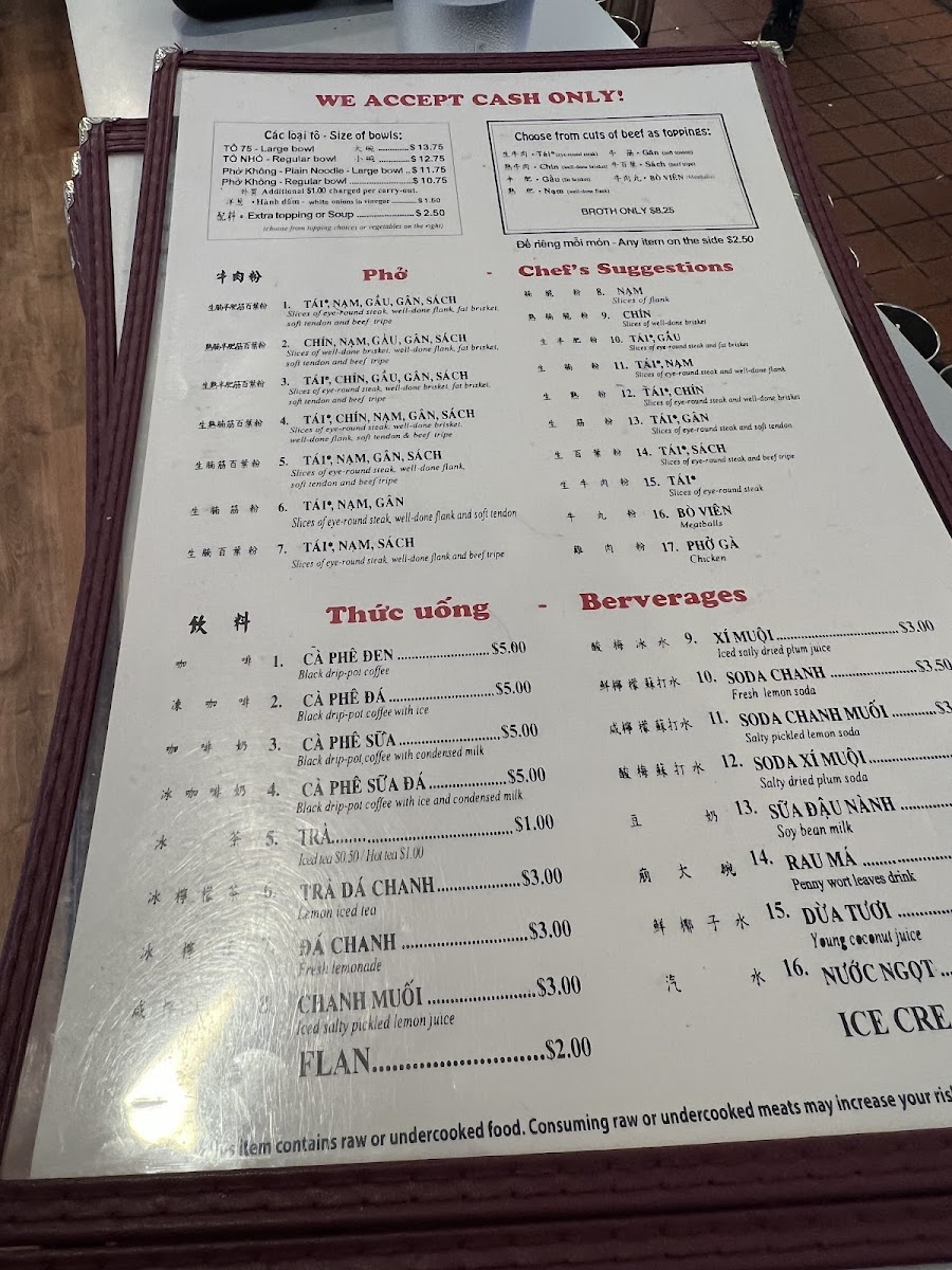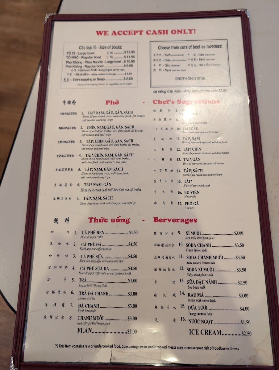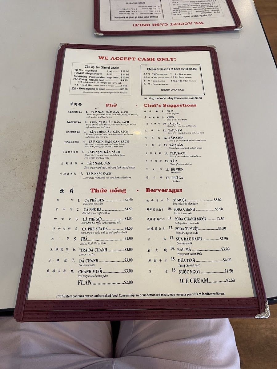 Welcome to Phở 75, where dedication to the art of pho shines. Located at 1122 Washington Ave F in Philadelphia, this restaurant is a haven for pho lovers. Known for their superb broth, the menu features a range of soups, with a Regular Bowl at just $5.75 and a Large Bowl for $6.45. Chef's suggestions highlight premium cuts like eye round steak, brisket, and tendon, providing a rich and satisfying experience. Desserts like dried logans and jello are simple yet delightful, each priced at $2.00. Diners rave about the freshness of ingredients and the friendly, attentive service. While some find the flavor a touch bland, many, like long-time customer Emil Yao, declare Phở 75 the best pho on the East Coast. With a commitment to exceptional pho, this restaurant truly caters to those seeking comfort in every bowl. Get ready for a delicious, aromatic adventure!